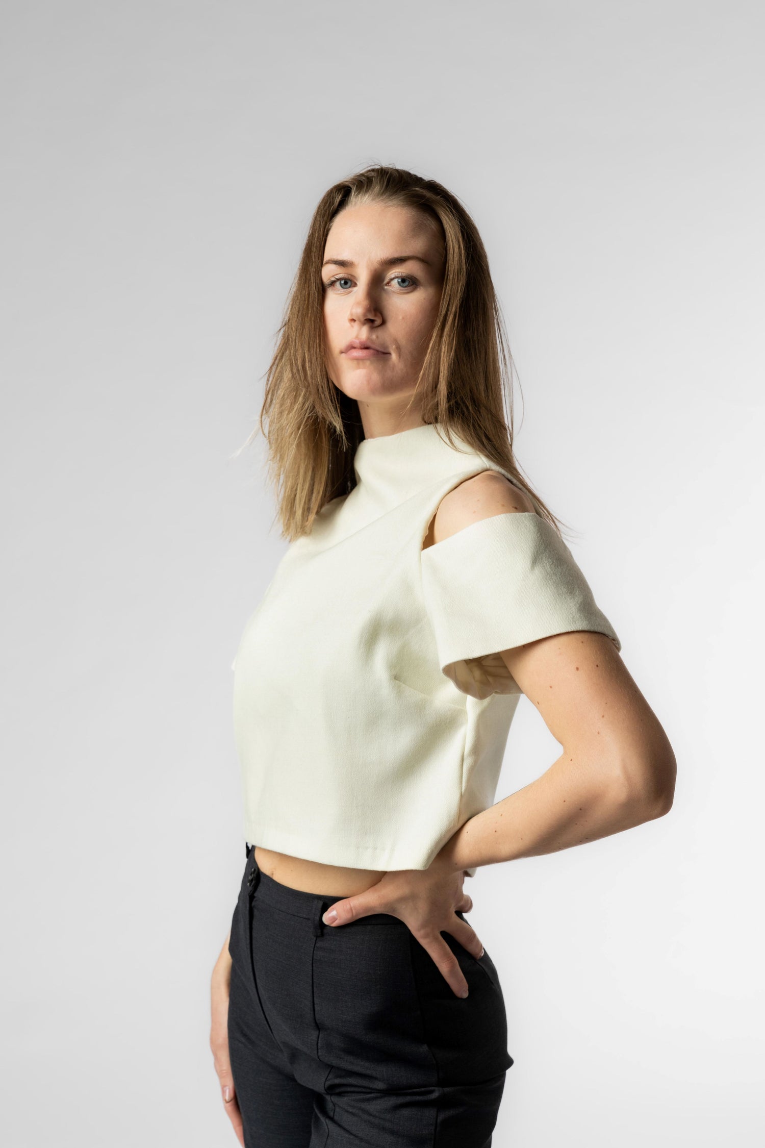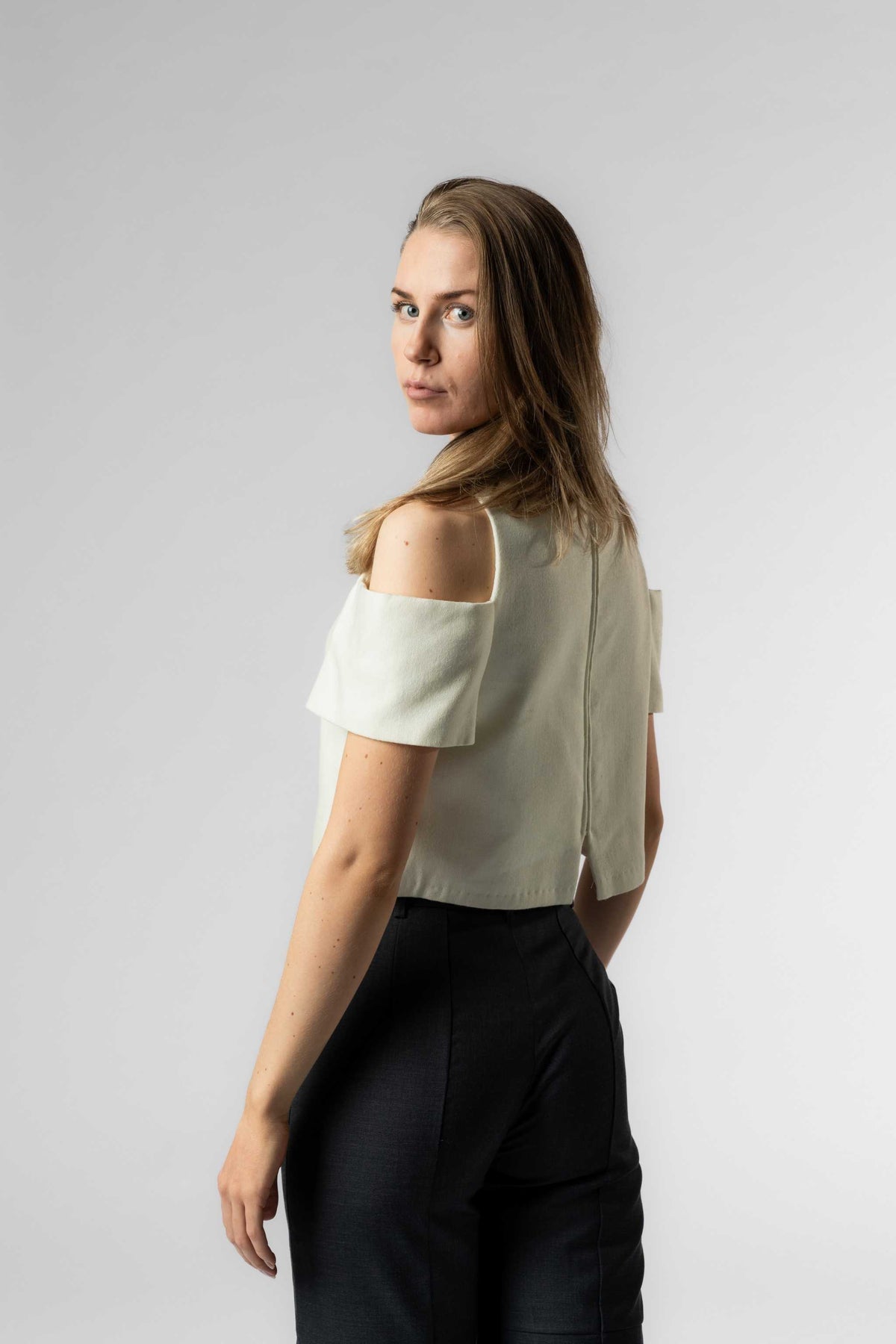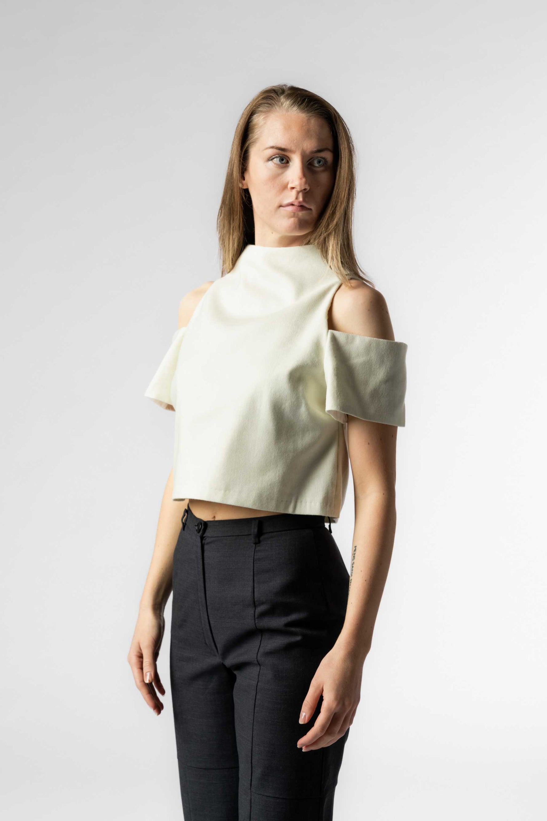 The design features exposed shoulders and a cropped fit with a zip closure, offering a unique and stylish silhouette that pairs effortlessly with various bottoms which makes it easy to adapt to different occasions.
